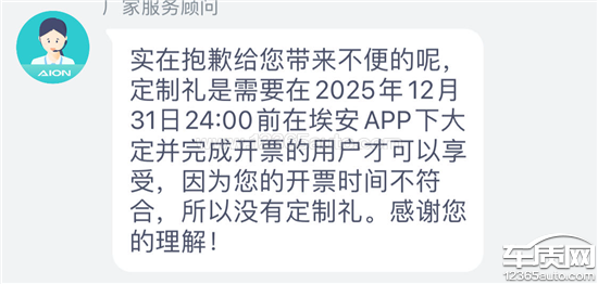 投诉事由:单方面增设购车权益兑现条件,涉嫌虚假宣传,侵害消费者合法权益。事实经过:1.购车承诺:本人于2025年12月6日支付大定,在官方APP创建订单。下单时,APP明确展示了包括“价值2600元养护礼”在内的各项购车权益。 2.履约受阻:因厂家原因导致车辆未能按时交付。 3.权益拒兑:本人要求厂家按承诺兑现“养护礼”时,对方却以“未在2025年12月31日前开具购车发票”为由拒绝。但查阅所有购车时的宣传材料,均未发现此项明确的限制性条款。 4.核心争议:厂家将自身原因造成的交付延迟后果转嫁给消费者,单方面增设合同未载明的苛刻条件,拒绝履行承诺,涉嫌虚假宣传和违约。诉求:1.要求广汽埃安立即无条件履行承诺,兑现“养护礼”全部权益。 2.要求厂家就其不诚信行为给出合理解释并致歉。