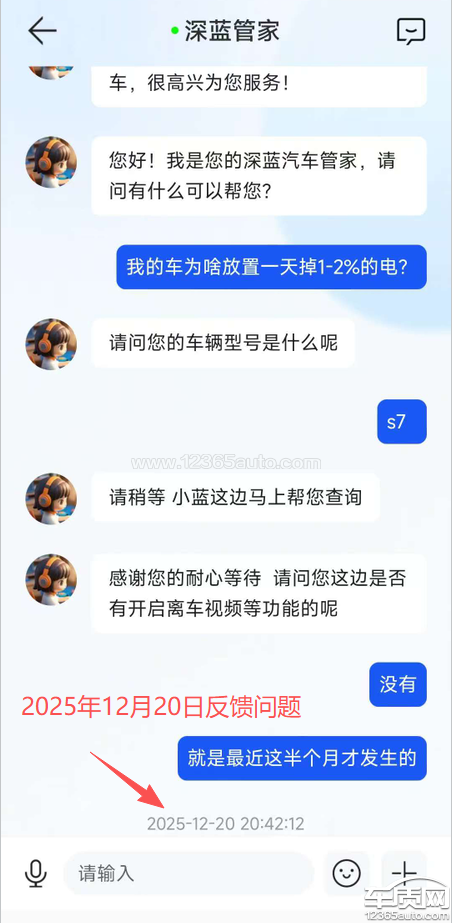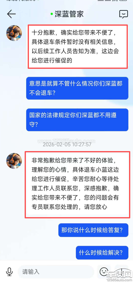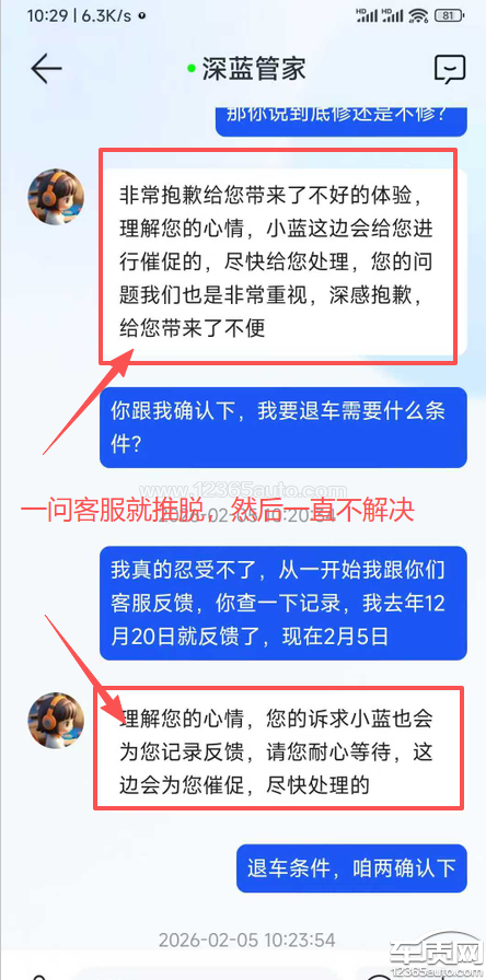 1、我的S7,只开了1.3万公里,现在放着不开每天一直掉电,每天以1%-2%的电量一直掉,而且车辆异响严重、抬头显、车顶、车门、以及升降玻璃等都有异响情况,2025年12月20日反馈,到现在已经过去47天了,深蓝汽车一直敷衍,一直拖延维修。(附件图片可以看出深蓝厂家推脱的态度)2、既然深蓝厂家一直拖延,维修时间超过了法律规定的时间,达到了退车的条件了,要求他们退车,他们还在敷衍、推脱。3、我的诉求是,深蓝不按相关法律规定执行,甚至达到退车条件,要求深蓝退车。