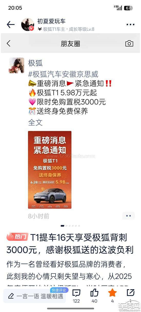 2026年1月7号,我在合肥购买极狐T1320pro一台,销售说这是一款全国统一特价车型,一口价且没有任何赠品,任何时候提车都没有差价,发票价62800自费2778元购置税,仅仅使用半个月,1月23号开始极狐对于新购t1用户补贴3000元购置税,但是对于2026年1月1号至22号已经购车用户,没有任何关怀补偿。对于此种针对性的突然降价行为,让我选择极狐t1的老用户感到心寒。 既然厂家能够购置税补贴,为何区别对待背刺老用户,品牌关爱何在?让极狐t1的老用户感到心寒,针对T1一口价车型补贴购置税,厂家所说的商业行为,也不是临时决定的,绝对是从1号到22号开始,就已经在商讨如何补贴购置税来救市,为什么不通知经销商,告知已交定金的用户暂缓提车,等政策出台,这样的车企还敢继续支持吗? 最新消息!!!本人所在T1购置税维权群内,东北及北京周边的1.1-22号提车车主,已经悉数拿到厂家的3000元补贴,试问这么大一个国企,营销失败的善后补偿还玩区别对待,真是令人感到恶心至极。