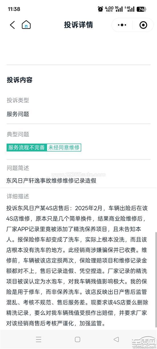 1投诉经过: 投诉东风日产4S店售后:2025年2月,车辆出险后在该4S店维修,原本只是几个简单换件,结果商业险维修后,厂家APP记录里竟被添加了精洗保养项目,且未告知本人。报保险修车却变成了洗车,实际上根本没洗,而且该店根本没有洗车的地方。此经销商涉嫌骗保并已收费。维修前,车辆被该店定损两次,保险理赔项目和维修记录金额都对不上,售后记录造假,凭空捏造。厂家记录的精洗项目被误认定为水泡车,对我车辆残值影响极大。我的保险是用于修车,而非保养洗车。该店反映出日产售后监管混乱,考核不规范,售后服务差。现要求该4S店要么删除精洗记录,要么对我车辆残值受损作出赔偿,并要求厂家对该经销商售后考核严谨化,加强监管。 2六安伟恒售后反馈:此经销商承认维修记录造假并承诺7天内删除记录,之后不了了之。在联系说没办法删不了。明知删不掉居然还骗车主能删,像这样捏造记录继续欺骗车主的嚣张态度和行为实在让人恶心简直火上浇油。这样板上订钉肆意捏造维保记录侵犯车主具有法律效力的个人信息的经销商,应该引起日产厂家相关部门的重视,如果六安伟恒突然不承认记录造假那就拿出当时精洗维修视频自证,希望厂家认真核实并给予此经销商处罚,不要让摸黑厂家形象,亵渎投诉平台,侵犯车主的权益的部分经销商肆意妄为。 3要求厂家对此经销商重点关注加强培训规范考核落到实处并对有损车主权益的行为做出相应赔偿。