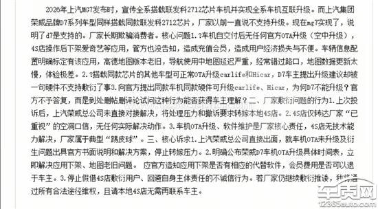 2026年上汽MG7发布时,宣传全系搭载联发科2712芯片车机并实现全系车机互联升级。而上汽集团荣威品牌D7系列车型同样搭载同款联发科2712芯片,厂家以前一直说不支持升级,现在MG7实现了,说明D7是支持的,厂家长期欺骗消费者。核心问题:1.车机自交付后无任何官方OTA升级(空中升级),4S店操作后下架爱奇艺等应用,官方也未告知,导致用户充值会员后无法使用,造成经济损失与不便;车辆信息配置明确标定有该应用,且高德地图版本老旧,导航使用中地图延迟严重,经常错过路口,地图数据更新过慢,使用体验极差。2.搭载同款芯片的其他车型可正常OTA升级Carlife和Hicar,D7车主提出升级建议,却被一句硬件不支持敷衍了事。3.向官方提出同款车机、同款硬件可升级Carlife、Hicar,为何D7不能升级的疑问,官方不予答复,反而到处删帖删评论,试问这种行为能否获得车主理解?二、厂家敷衍问题的行为:1.此前反馈相关问题后,上汽荣威总公司未直接对接解决,将处理压力和相关要求转嫁至本地4S店。2.4S店仅转达厂家“已重视”的空洞口信,未采取任何实际解决动作。3.车机OTA升级、软件维护是厂家的核心责任,4S店无相关技术能力解决该类问题,厂家此举属于典型的“踢皮球”行为。三、核心诉求:1.上汽荣威总公司直接出面,就车机OTA未升级及衍生问题出具官方书面说明和解决方案,停止向4S店转嫁压力。2.明确公布荣威D7车机OTA升级具体时间表,立即解决应用下架、地图老旧问题;官方需告知应用下架后是否有相应的替代软件,以及用户充值的会员费用能否退还。3.停止假借4S店敷衍用户、回避自身主体责任的不诚信行为。若厂家仍继续敷衍推诿,将通过所有合法途径维护自身权益,且无需4S店再进行联系。