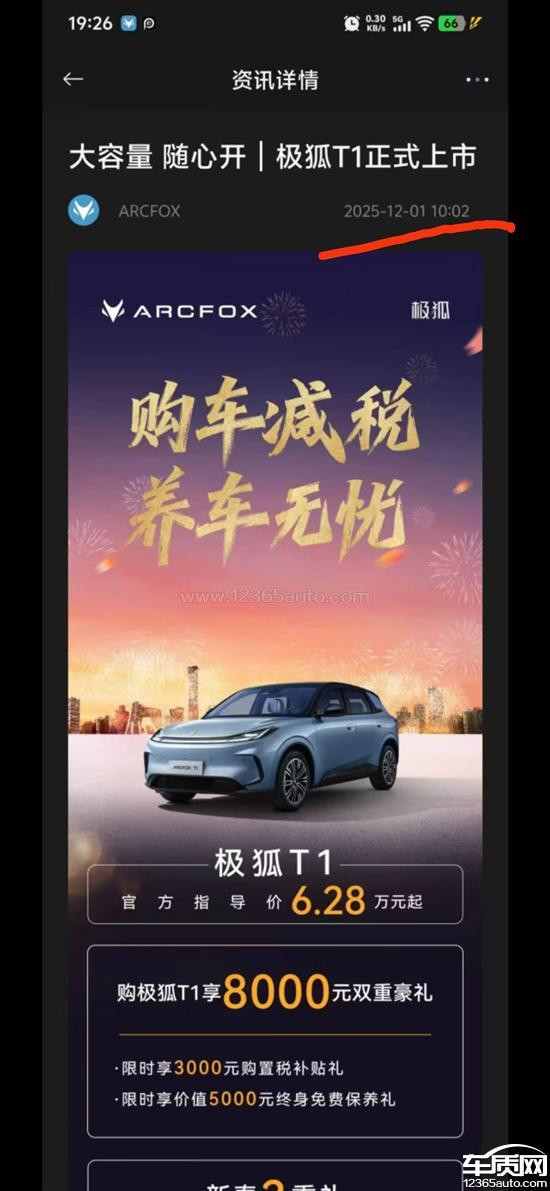 我于1.5日在临沂双岭路极狐店购买汽车12日交的购置税,登录汽车app发现12.1日发布在26年1.23日至2.28日购买T1有3000元购置税补贴,购买时销售与4s店未告知有这个活动,,3000元对一个打工人来说一个月的工资,谁的钱也不是大风刮来的,找销售就推说当时不知道有这个活动,给老百姓做主。