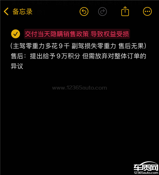 中控车机屏-屏幕里有虫子。 售后:拆换车机屏。左后门把手松动 售后:更换门把手总成。主驾门窗左后侧雨天时有挤压声异响 售后:没下雨无法检测暂未解决。主驾轻按开门键偶发失效!(视频记录) 售后:认为正常按深一些就好。雨天驻车右门板内部有明显水滴声 售后:测试后的确出现车内能听见门内部有水滴声属于正常现象。左右窗户漏风(冬天明显) 售后:三角区漏风已改善、B柱还是漏风。行驶过程中异响(即便开在沥青路上稍有振动就有异响! 售后:未解决!回复说是空悬传出来的异响(属于正常现象)。交付当天隐瞒销售政策导致权益受损 (主驾零重力多花9千副驾损失零重力售后无果) 售后:提出给予9万积分但需放弃对整体订单的异议。