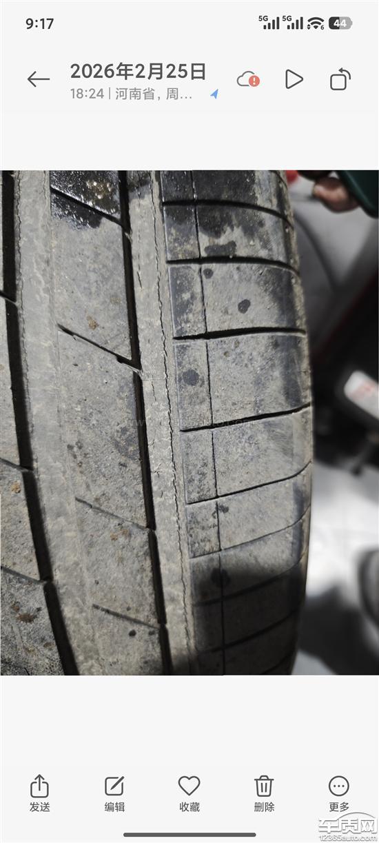 本人购车时间是2024年10月份在一万公里(25年6月)的时候就发现开裂情况,当时看开裂不太严重就没管。2026年2月15日补胎时发现开裂愈发严重,并在3月17日向韩泰轮胎厂家申请索赔,厂家同意索赔但补过胎的右后轮不赔(说是公司规定),个人认为补胎和开裂无关联并且本人补胎之前轮胎就已经开裂严重(上传图片可证明),所以要求厂家照常赔付所有开裂轮胎。