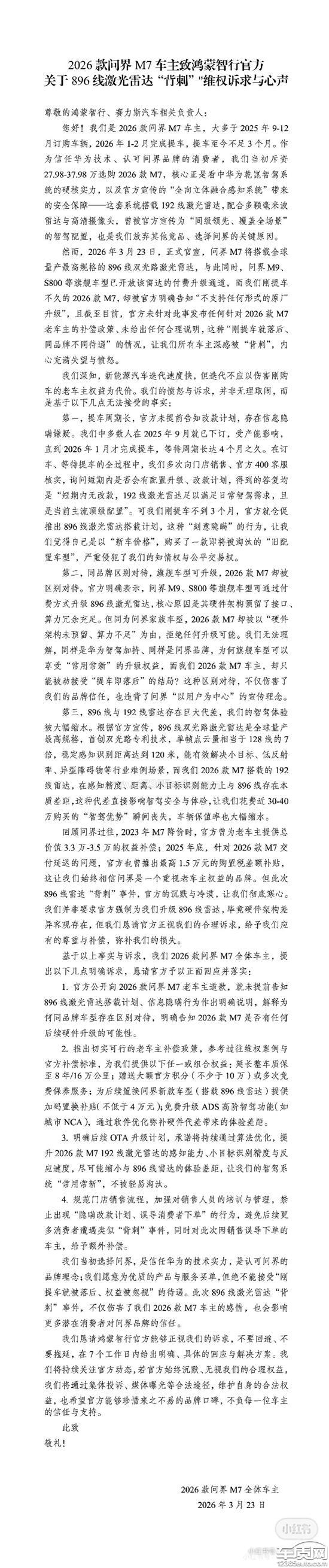 本人于提车2026款问界M7,并遇到以下问题。1.被割韭菜:提车仅三个多月,官方即推出896线激光雷达版M7,性能远超现款192线雷达,刚刚进行的大改款,还没有多久就升级896线激光雷达,存在销售欺诈嫌疑。2.区别对待:官方仅允许M9升级896线雷达,却禁止M7老车主付费升级,导致我的车辆刚买就大幅贬值,核心技术落后。诉求:要求官方开放M7硬件升级通道,或给与差价补贴。