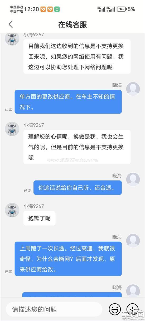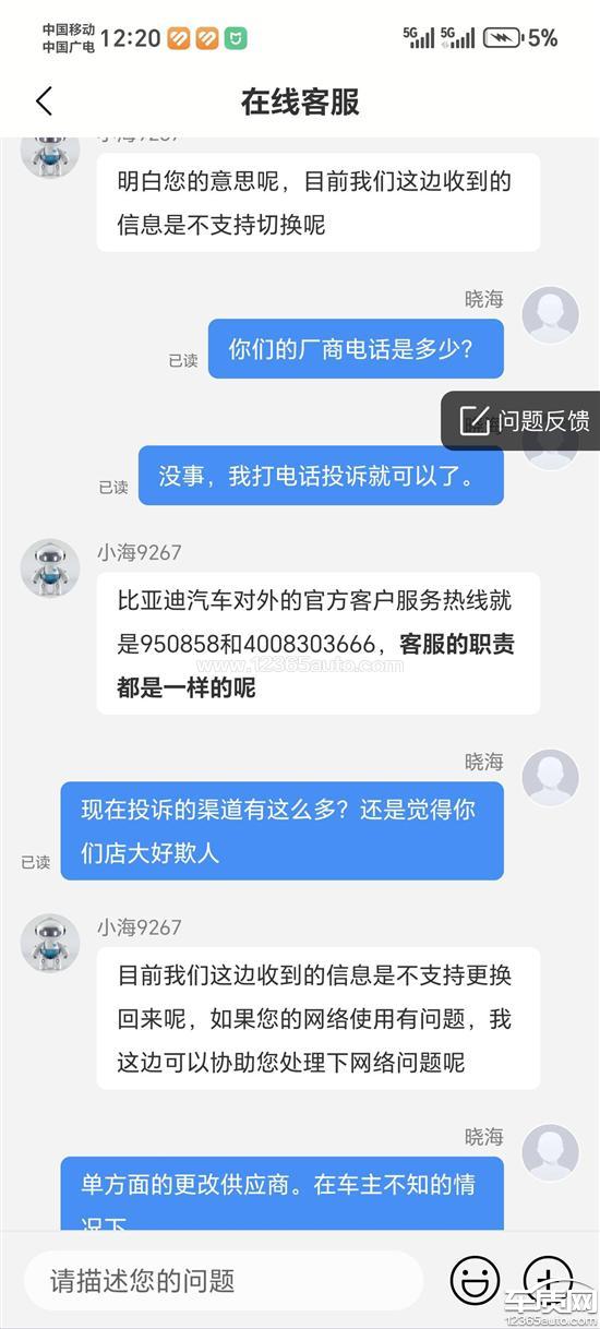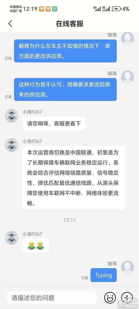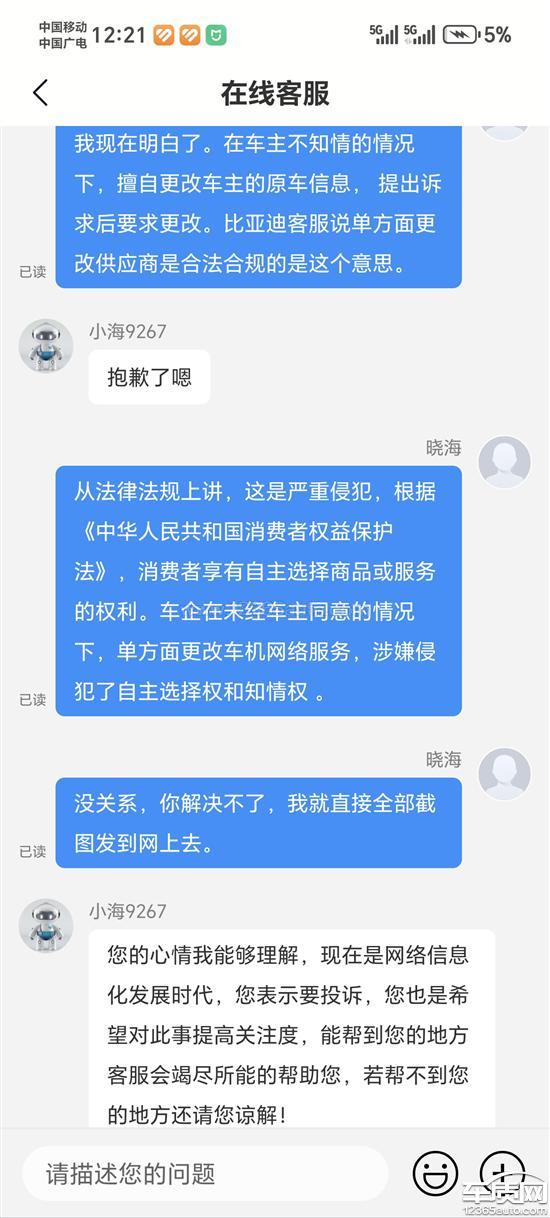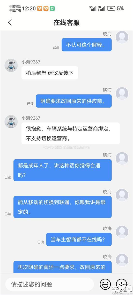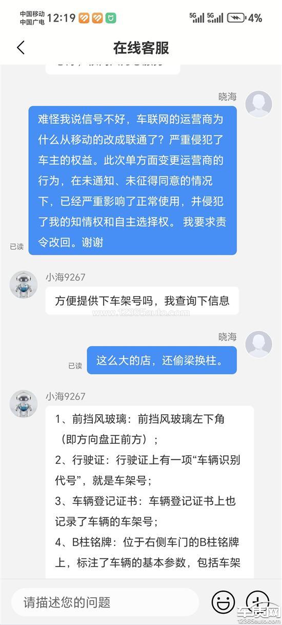 比亚迪海狮06ev是在2025年10月底购买的,当时看的运营商是移动的。前段时间跑高速走隧道网络有延迟问题就很奇怪,最近发现车载网络供应商从移动改为联通。向客服说明,此次单方面变更运营商的行为,在未通知、未征得同意的情况下,已经严重影响了您的正常使用,并侵犯了您的知情权和自主选择权。明确要求要改回原来的供应商。客服单方面说不可以。