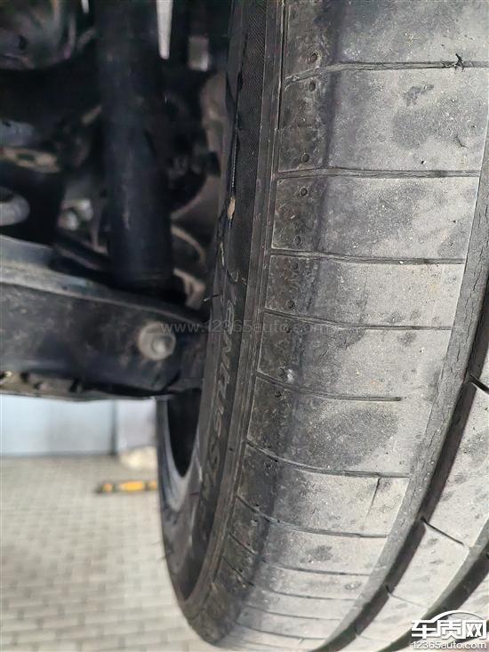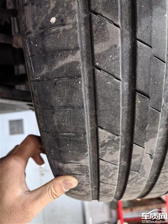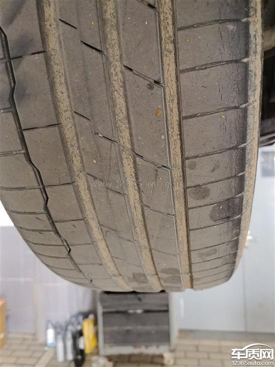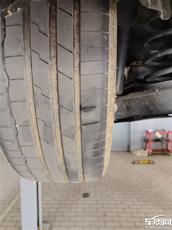 上汽大众帕萨特前后4条轮胎存在裂缝,且不同程度偏磨严重,啃胎现象明显,存在安全隐患,要求处理。