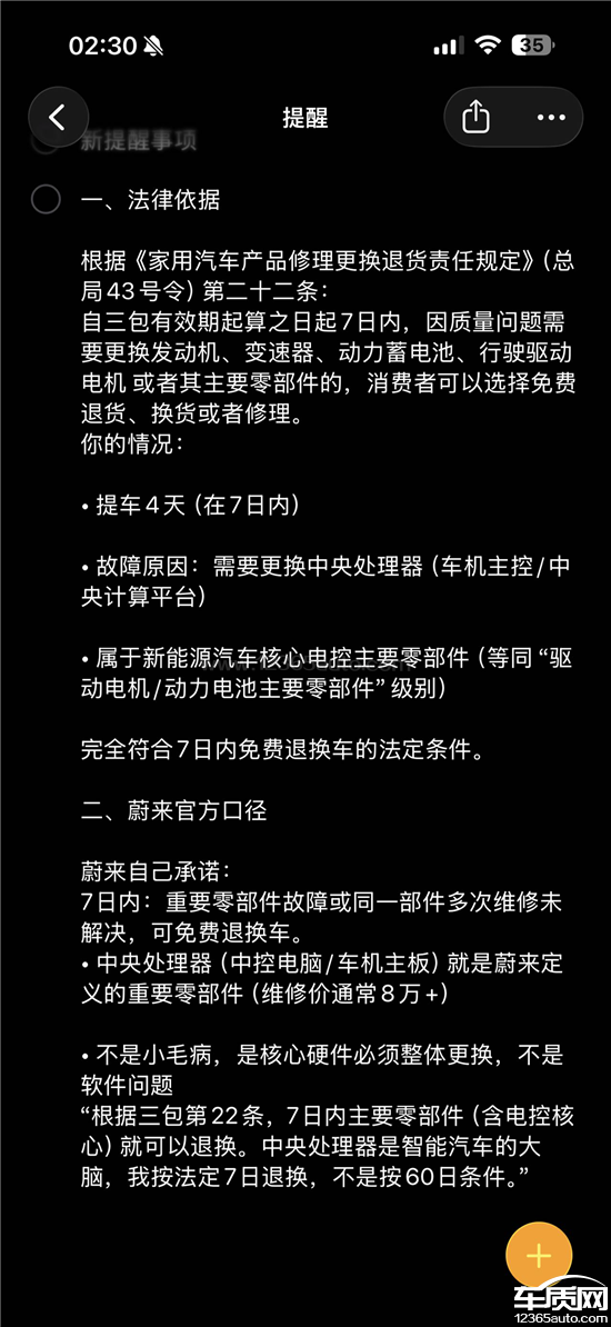 购车发票日期/提车日期:2026年4月4日。截至2026年4月8日晚22时30分出现问题为止,该车提车仅4天,行驶里程110公里,即出现中控屏幕完全黑屏故障,无法正常使用,已严重影响行车安全与车辆基本功能。经贵方官方检测确认,故障原因为中央处理器损坏,需整体更换。根据《家用汽车产品修理更换退货责任规定》第二十二条:自三包有效期起算之日起7日内,因质量问题需要更换动力蓄电池、行驶驱动电机或者其主要零部件等情形的,消费者可以选择免费退货、换货或者修理。本次故障涉及车辆核心电控部件,完全符合上述法定退换条件。现本人正式明确提出维权诉求:1.拒绝维修方案;2.要求立即为我办理全额退车或免费更换全新蔚来ES8车辆。