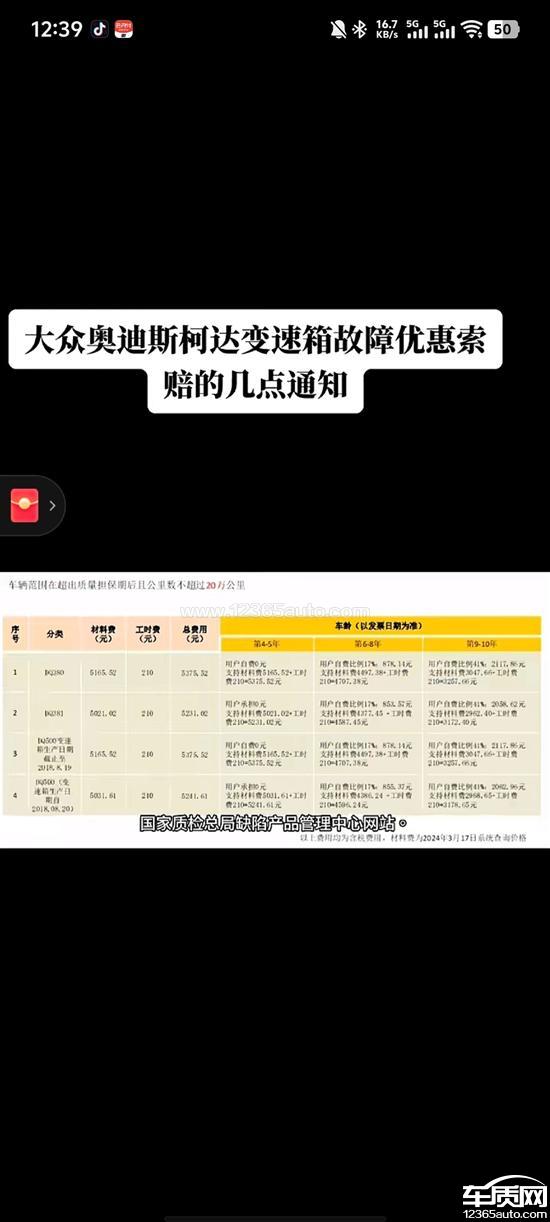 车辆于4月7日,正常行驶中仪表盘突然出现,变速箱处于紧急运行模式,随后偶数挡倒挡丢失,车辆无法正常行驶,动力中断,拨打厂家电话告知送到4S店进行检测,4月8日送到长春4S店进行检测,当时有位工作人员一边打电话询问如何检测一边操作,检测后电脑已出现故障码,却说他没有见过这个故障码,需上报领导才可以告知具体故障码。过了两天后仍没有任何消息。我不得不拨打厂家电话后,4S店才有工作人员联系我,告诉我是变速箱故障,我问具体故障码才告知我具体故障码是P176F00,方案是要更换传感器或TCU,告知换传感器可能不解决问题,需要换变速箱,然后我又问,换变速箱会不会百分百好?他说他不敢保证。我问维修费用是否有优惠政策,他说,我们没有优惠政策,并把费用简单地给我发了过来,没有具体明细,之后就再也没有4S店的工作人员给我打来任何电话。期间和厂家联系,问为什么变速箱没有达到国家标准耐久试验的标准不低于16万公里。厂家客服和我说要4S店的技术人员给我打电话解答,截止目前已经过去了七八天,我没有接到4S店的任何电话或短信,4S店就不联系我了。然后我拨打市民热线询问办法,市民热线的工作人员告知我可以联系购车的4S店,问问可不可以解决。我拨打了襄阳市市民热线,于今天,襄阳市4S店的售后经理给我打反馈电话,告诉我由于我不在襄阳市,无法进行维修。并告知厂家对大众探岳DQ381的变速箱是有优惠政策的。在场的还有市场监督管理局的工作人员,市场监督管理局的工作人员告诉我,一汽大众全国联保在任何一家4S店都可以进行维修,也证实了厂家确实有优惠政策,有录音为证,也告诉我,如果长春4S店没有给我进行维修,可以打12315进行投诉,可为什么长春4S店告知没有任何的优惠政策?需要我自费维修,并且售后极其差。售后不光是交谈的态度好,还要去解决问题,车已经停在了4S店12天,4S店未有任何进展,期间我拨通厂家电话,客服告知我挂了电话后会联系4S店的技术人员给我反馈,但我并未接到4S店的任何电话,我的问题也得不到任何的解决,我可以不在这个4S店修,可是车现在处于故障,我不敢开走,变速箱故障,偶数挡和倒挡丢失,谁都不能对人身安全不负责,如果开走后车辆突然动力中断,失速造成交通事故又该如何?如果厂家没有优惠政策,襄阳市4S店的售后经理就不会告知我有优惠政策,难道不是一个厂家吗?优惠政策还有选择性的告知吗?希望长春4S店履行厂家优惠政策更换改进版TCU。