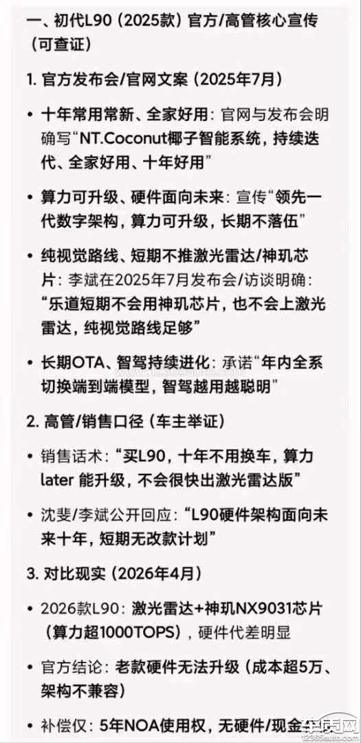 2025年9月25日购车。购车仅6个月,该品牌便推出2026款改款车型,改款车型配置大幅升级却保持原价,严重侵害老车主权益,现正式投诉。一、核心问题(背刺老车主):1.隐瞒改款计划,侵犯知情权:购车时,相关工作人员明确告知短期内无重大改款,2025款为最新主力车型,而该品牌刻意隐瞒产品迭代计划,仅数月后便推出搭载激光雷达、高算力芯片、全面升级智驾系统的2026款车型,违反《消费者权益保护法》,导致老车主在信息不对称的情况下购车。2.配置差距悬殊,老车大幅贬值:2026款车型新增激光雷达、高阶智驾、更强芯片等核心硬件,而老款车型无法通过OTA升级获得同等配置,同价位下新车配置远超老款,导致老款车辆二手价值大幅缩水,早期支持该品牌的老车主沦为“弃子”。3.补偿方案缺失,忽视老车主权益:改款后,该品牌未针对老车主提供任何补偿方案,无视老车主的信任与损失,寒了老车主的心。二、投诉诉求:1.该品牌官方公开道歉,承认侵害老车主知情权及合法权益;2.为老车主提供合理补偿方案,如硬件升级、现金补贴等;3.建立透明的产品迭代告知机制,杜绝此类“背刺”行为再次发生。