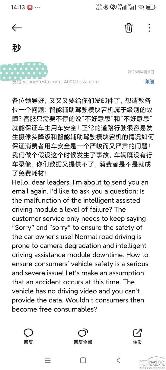 4月5日上午9点13分18秒,车辆在正常行驶过程中,智能辅助驾驶模块突然宕机,宕机时间长达10多秒,期间没有任何提醒。官方答复称这是车辆软件问题,需要通过后期更新进行修复。截至目前,尚未收到关于修复情况的答复。(如果确实是软件问题,该品牌车辆可能存在严重安全隐患)。一直未处理!!!特斯拉的答复疑似机器人。