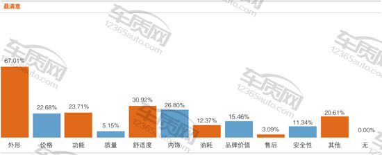 在“对这款车型最满意的地方”调查中,选择“外形”的车主最多,为67.01%,且没有车主对外形表示不满。紧随其后的是舒适度(30.92%)和内饰(26.80%)。就此次调查而言,个性、美观的造型让更多人喜欢上了KX3,而在实际使用中遇到的小问题虽然会引起消费者的负面情绪,但因未涉及到驾乘安全,所以最终还是没有拖累KS3的整体表现。