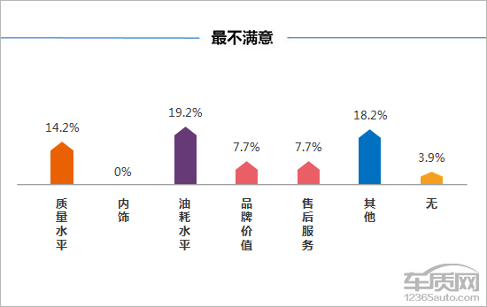 从此次WEY VV7车型“最满意”的选项结果来看,有19.2%的车主均对外形表示满意,可见该车年轻运动的外形是深受消费者喜爱的。其次是价格性价比方面,有18%的消费者认为该车在价格上颇具诚意,其顶配车型才18.88万元,这样的价格也很容易让中产家庭接受。而在“不满意”方面,有19.2%的车主对车辆耗油水平有所抱怨,此外,由于异响问题的存在,部分车主对于WEY VV7的质量水平同样有所抱怨。据车质网数据显示,针对车主们的各种诉求,WEY也在积极为消费者排查解决问题,这一点也得到了大多数车主的肯定。