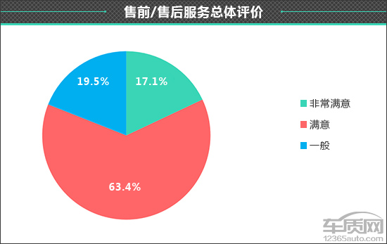 在售前/售后服务总体评价中,接受调查的车主还是给出了客观中肯的评价,其中认为“非常满意”的车主占比为17.1%;认为“满意”的车主占比为63.4%;认为“一般”的车主占比为19.5%。