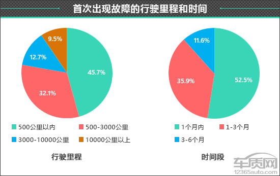 在这些出现非人为故障的车辆中,首次故障出现在行驶里程500公里以内的占比最高,为45.7%;其次是行驶里程在500-3000公里出现故障的车辆,占比为32.1%。而对于首次出现故障时间段的调查结果显示,对于大多数受访车主而言,车辆首次故障均出现在购车1个月内,占比为52.5%。
