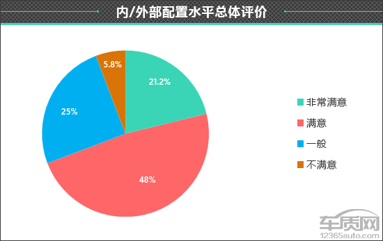 总体来看,2023款荣威D7外部和内部的综合表现达到了车主的预期,有21.2%的车主表示“非常满意”,认为“满意”的车主最多,占比高达48%,给出“一般”的评价占比为25%,明确表示“不满意”的受访车主评价占比仅为5.8%。