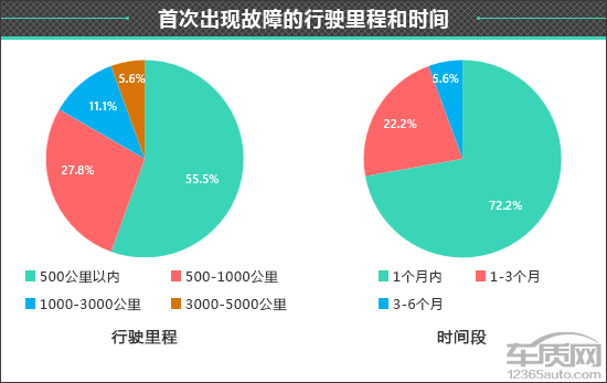 在这些出现非人为故障的车辆中,首次出现故障行驶里程在1000公里以内的占比之和超过总量的八成,其中500公里以内的投诉占比最高,达到55.5%。而对于首次出现故障时间段的调查结果显示,超七成的车主表示车辆在购车1个月内便出现了故障。