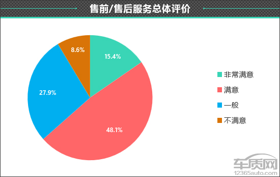 不过,在售前/售后服务总体评价中,接受调查的车主还是给出了客观的评价,其中认为“非常满意”的车主占比为15.4%;认为“满意”的车主占比为48.1%;认为“一般”的车主占比为27.9%;明确表示“不满意”的车主占比为8.6%。