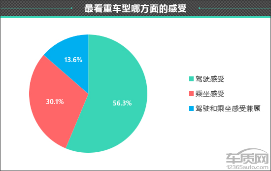 在衡量一款车型驾乘感受如何时,每个人所看重的部分不尽相同。在此次调查中,有56.3%的车主表示更看重“驾驶感受”。另外还有30.1%和13.6%的车主分别看重“乘坐感受”和“驾驶和乘坐感受兼顾”。