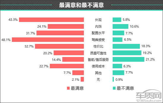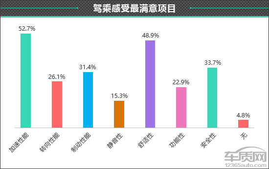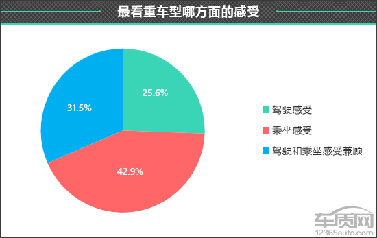 在衡量一款车型驾乘感受如何时,每个人所看重的部分不尽相同。在此次调查中,有42.9%的车主表示更看重“乘坐感受”。另外还有31.5%和25.6%的车主分别看重“驾驶和乘坐感受兼顾”和“驾驶感受”。