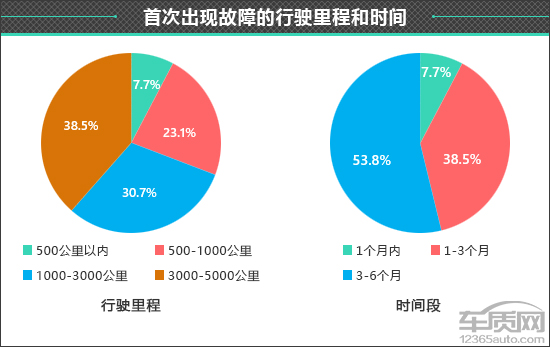 在这些出现非人为故障的车辆中,首次故障出现在行驶里程3000-5000公里的占比最高,为38.5%。而对于出现故障时间段的调查结果显示,有53.8%的车主表示车辆在购车3-6个月便出现了故障。