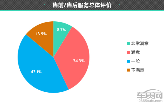 不过,在售前/售后服务总体评价中,接受调查的车主还是给出了客观的评价,其中认为“非常满意”的车主占比为8.7%;认为“满意”的车主占比为34.3%;认为“一般”的车主占比最高,为43.1%;明确表示“不满意”的车主占比为13.9%。