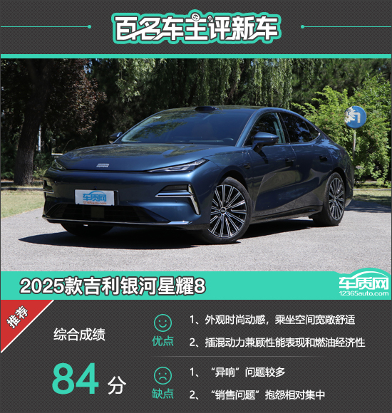 在收集到的105份有效问卷中,根据车主对2025款吉利银河星耀8在车型基本面、驾乘感受、使用成本以及质量可靠性、售前/售后服务方面给出的真实评价,在此次调查中2025款吉利银河星耀8的综合得分为84分,达到了车质网的推荐标准。