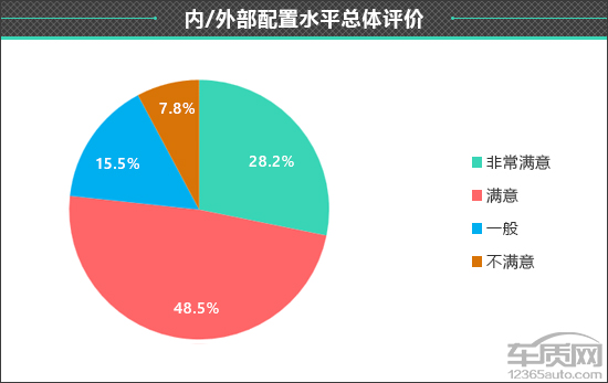 总体来看,2025款吉利银河A7外部和内部的综合表现达到了车主的预期,分别有28.2%和48.5%的车主表示“非常满意”和“满意”,15.5%的车主表示“一般”,仅有7.8%的车主明确表示“不满意”。