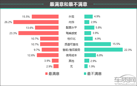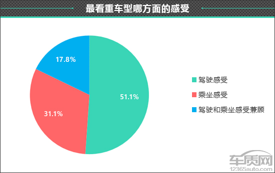 在衡量一款车型驾乘感受如何时,每个人所看重的部分不尽相同。在此次调查中,有51.1%的车主表示更看重“驾驶感受”。另外还有31.1%和17.8%的车主分别看重“乘坐感受”和“驾驶和乘坐感受兼顾”。