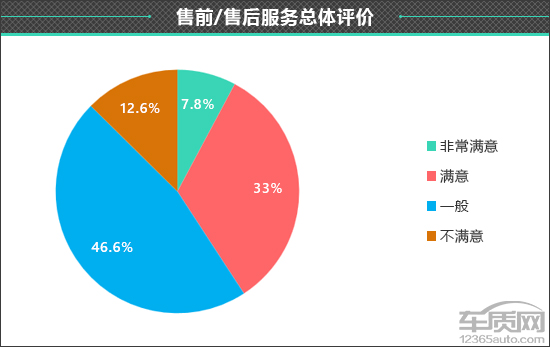 不过,在售前/售后服务总体评价中,接受调查的车主还是给出了相对客观的评价,其中认为“非常满意”的车主占比为7.8%,认为“满意”的车主占比为33%,认为“一般”的车主占比为46.6%,认为“不满意”的车主占比为12.6%。