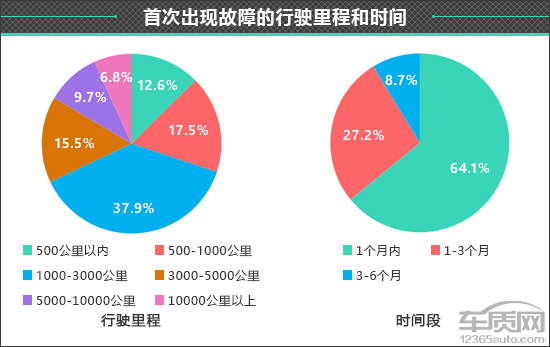 在这些出现非人为故障的车辆中,首次故障出现在行驶里程1000-3000公里的占比最高,为37.9%。而对于出现故障时间段的调查结果显示,有64.1%的车主表示车辆在购车1个月内便出现了故障。
