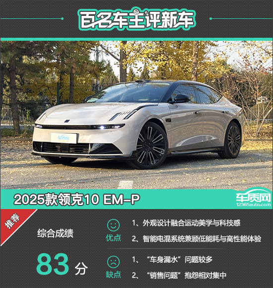 在收集到的103份有效问卷中,根据车主对2025款领克10 EM-P在车型基本面、驾乘感受、使用成本以及质量可靠性、售前/售后服务方面给出的真实评价,在此次调查中2025款领克10 EM-P的综合得分为83分,基本达到了车质网的推荐标准。
