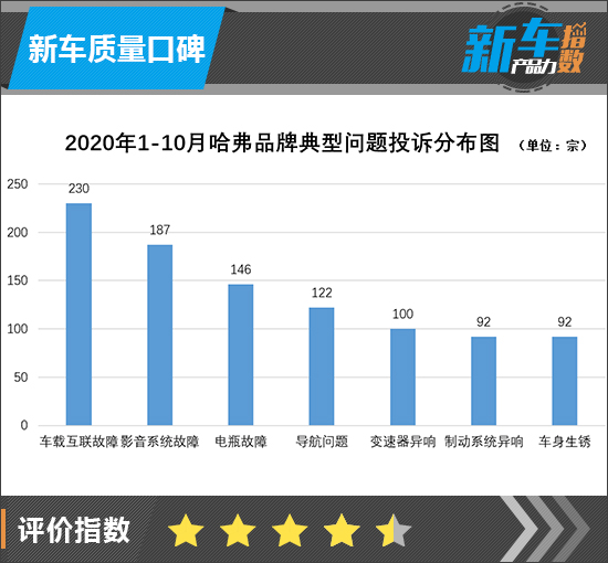 由于哈弗初恋为全新车型,因此将参考其所属品牌以往的投诉情况进行分析。数据统计显示,2020年1-10月车质网共收到关于哈弗品牌投诉共计1556宗,从典型故障问题来看,车载互联故障、影音系统故障、电瓶故障、导航问题投诉量相对较多。由于哈弗初恋为全新车型,基于全新的柠檬平台打造,车辆软硬件均进行了升级调整,因此可以暂且认为哈弗初恋出现以上问题的几率较小,但实际情况如何,还要待其上市使用后才能有定论。