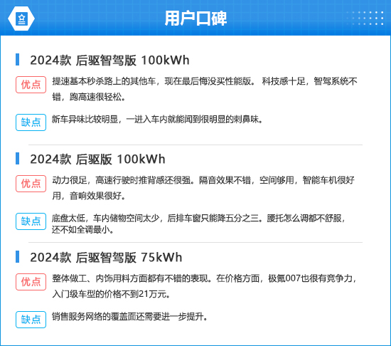 在用户口碑中,多数消费者对2024款极氪007的动力性表示满意。不过,也有车主表示该车存在储物空间较少的问题,另外还有车主吐槽其并存在车内异味的问题。