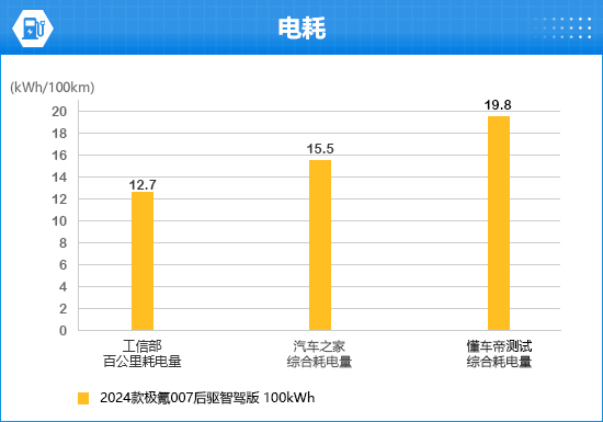 2024款极氪007的工信部耗电量为12.7kWh/100km。通过对比两大汽车垂直媒体的测试数据来看,均高于工信部数据。其中,懂车帝数据最高,综合耗电量为19.8kWh/100km。