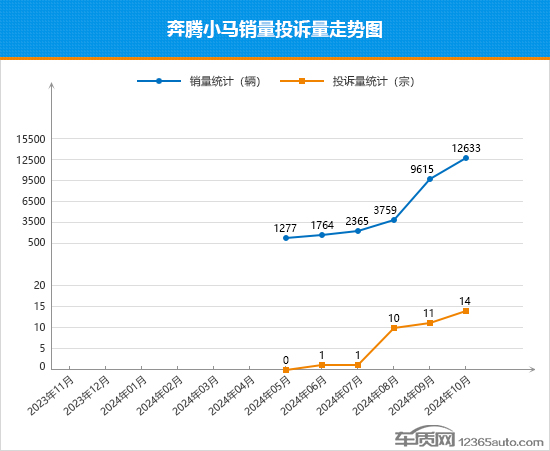 作为一汽奔腾旗下首款纯电动微型车,奔腾小马被寄予厚望。尽管其上市之初市场表现平平,但随着车型陆续投放市场,销量走势也逐渐步入正轨。10月份,上市5个月后,奔腾小马终于实现了销量破万,累计31,413辆的成绩也顺利成为一汽奔腾新的销量支柱。进入2024年下半年,伴随着销量阶梯式增长,奔腾小马的月投诉量也开始攀升至两位数,10月份达到其上市以来的最高点,短期口碑有所转差,产品细节方面还有待进一步优化。从其10月份的投诉销量比数值来看,与9月份相比虽略有下降,但仍保持在两位数,投诉销量比表现还有待进一步提升。近期,奔腾小马推出了长续航版车型,产品竞争力得到增强,对于未来市场表现或将起到一定的刺激作用。