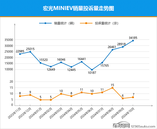 10月,宏光MINIEV迎来高光时刻,时隔19个月销量再次突破3万辆,打赢“翻身仗”。从其近一年来的销量投诉走势可以看到,整体呈现出“V”字形走势,在2024年6月销量跌至谷底后,开始迅速反弹,连续四个月实现环比增长,曾经国内轿车市场的“霸主”再露峥嵘。今年1-10月份,宏光MINIEV累计销量188,617辆,与去年同期相比仅微降了0.7%,能否顺利完成年度销量正增长,还要看最后两个月的表现。反观其月投诉量走势,近一年中,过半数月份的投诉量都保持在个位数水平,短期口碑表现值得肯定。从10月份宏光MINIEV的投诉销量比数值变化来看,与9月份相比虽然略有升高,但仍保持在个位数,在榜单所有车系中排名前列,投诉销量比表现保持稳定。有媒体报道称,宏光MINIEV近期或将迎来换代,并推出四门版车型,有望带动销量进一步回暖,重返巅峰时刻。