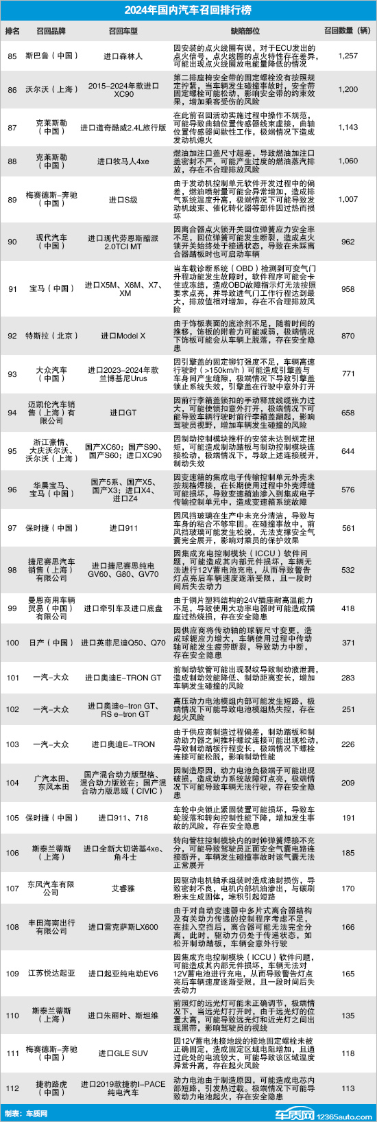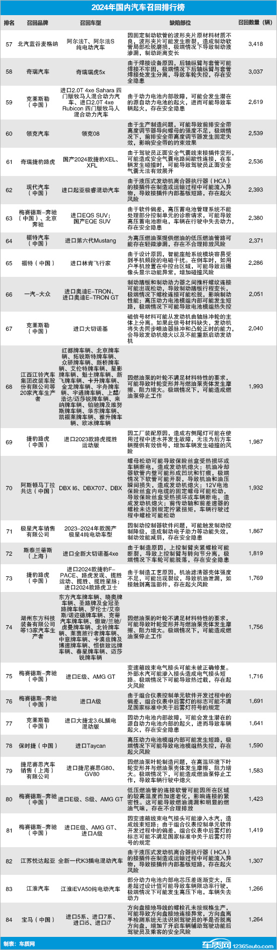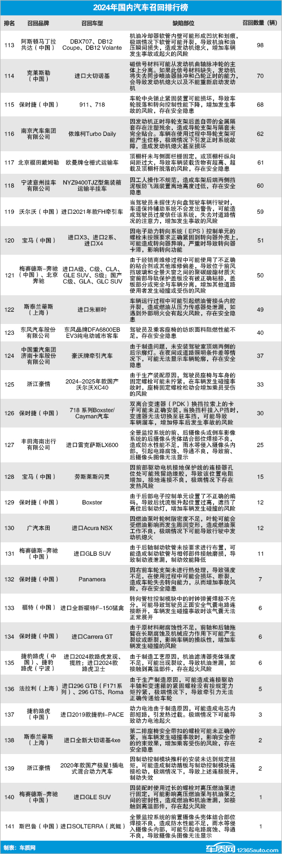 为便于消费者更加清晰地了解2024年国内汽车召回情况,车质网将国家市场监督管理总局公告进行整理,按召回数量由大到小进行排序,最终得出以下排名: