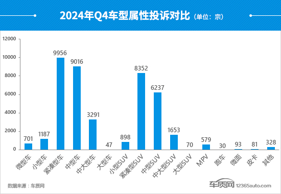 从车型属性投诉对比来看,紧凑型车的投诉量依旧领跑各车型属性,但较三季度下降了7%,在季度投诉总量中的占比已不足1/4。小型车本季度投诉量涨幅明显,创造了近2年来的最高纪录,环比上涨79.6%,投诉集中在部分自主品牌新能源车型。此外,紧凑型SUV的投诉量也出现较大增长,环比上涨25.8%,成为投诉量最高的SUV车型。