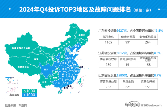 广东省四季度的投诉量依旧排名地区首位,环比微增0.5%,但投诉占比略有下降;江苏省和山东省的投诉量环比也都有小幅增长。“影音系统故障”成为三个省份都有所涉及的故障问题,特别是江苏省和山东省,在故障问题排名中高居首位。此外,“变速箱电脑板故障”成为江苏省本季度涨幅较大的故障问题,投诉量环比上涨69.9%。
