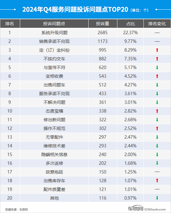 服务问题的投诉问题点占比情况与三季度略有不同,销售欺诈异军突起,投诉问题数环比翻倍增长,成为占比最高的服务问题,已超过总量的1/4。此外,服务流程不完善的投诉问题数环比涨幅超过了8成,占比提高了6.3个百分点,投诉问题点集中在“系统升级问题”,与长安汽车、长城汽车旗下部分车型有关。