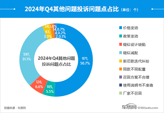 服务问题于四季度迎来爆发,投诉量环比上涨53.9%,达到近2年来的顶峰,投诉占比提高了6个百分点。同期,质量问题的投诉量与三季度接近持平,但投诉占比降低了3.4个百分点。相比之下,其他问题的投诉量持续缩水,已降至年内的最低点,口碑表现回归常态。