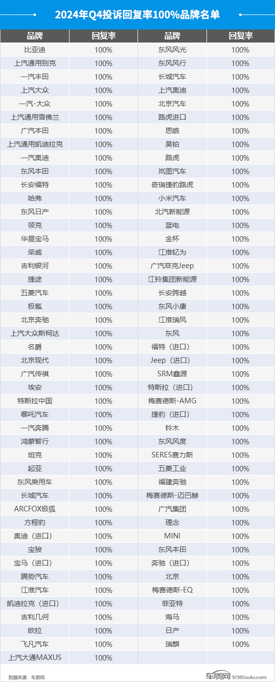 四季度投诉回复率达到100%的品牌共有91家,其中近6成为自主品牌,较上季度增加10家,与2023年同期相比增加8家。对待消费者诉求的积极态度以及重视程度要好于合资和进口品牌。
