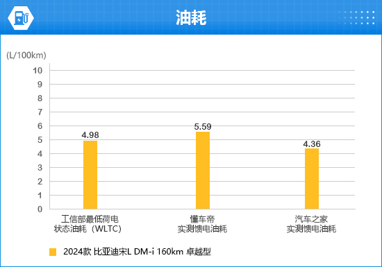通过收集工信部申报信息以及各大汽车垂直媒体的测试数据来看,2024款比亚迪宋L DM-i官方公布的WLTC工况最低荷电状态油耗为4.98L/100km;汽车之家实测馈电油耗为4.36L/100km,懂车帝实测馈电油耗为5.59L/100km(以上数据仅供参考)。