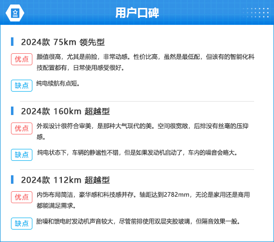 在用户口碑中,多数消费者对2024款比亚迪宋L DM-i的外观、空间和舒适性表示满意。不过,也有车主表示该车行驶静音性表现一般,尤其是胎噪和发动机噪音稍大。