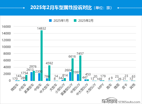 从2月份车型属性投诉变化来看,中型车取代紧凑车成为投诉量最高的车型,历史首次突破万宗,环比涨幅超过5.4倍。其中,某自主品牌旗下车型成为投诉“重灾区”,集中在其他问题,具体投诉问题点为“新旧款迭代纠纷”。相对而言,微型车本月投诉量逆势走低,环比下降15.9%,短期口碑表现呈现出向好趋势。