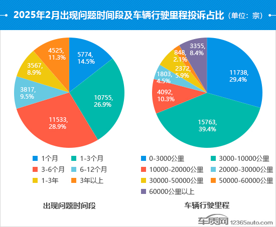 2月,行驶里程在10000公里以内的投诉量和投诉占比双双走高,环比增长7.7倍,提高了42.3个百分点,某自主品牌旗下车型贡献了绝大部分投诉量。同期,行驶里程60000公里以上的投诉占比缩减至个位数,较1月份降低了16.5个百分点,投诉故障点集中在“仪表台开裂”和“部件老化”,与部分丰田品牌车型有关。