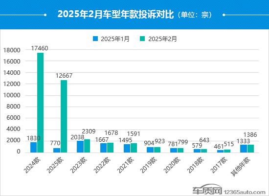 2月,2024款和2025款车型一骑绝尘,投诉量双双突破万宗,绝大部分投诉来自于新能源车型。相比之下,2022款和2023款车型投诉量环比微增,整体走势已趋于平稳。