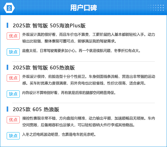 在用户口碑中,多数消费者对2025款海豹06GT的外观设计和操控性方面表示满意。不过,也有车主表示该车在续航里程方面还是存在问题,主要体现在冬季折损较为明显。