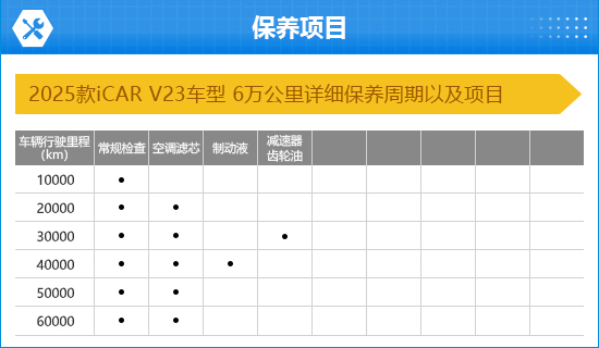 2025款iCAR V23整车质保周期为五年或12万公里(以先到为准),终身质保要求首任及非营运车主(责任免除条款以官方为准)。保养方面,每10000公里或12个月进行整车常规检查,包含电池、电机、底盘、轮胎和制动系统等关键部件。空调滤芯在20000公里时进行首次更换,后续每10000公里或12个月更换一次;制动液每40000公里或24个月更换一次;首次行驶30000公里或24个月时更换减速器齿轮油,后续每36个月或40000公里更换一次。